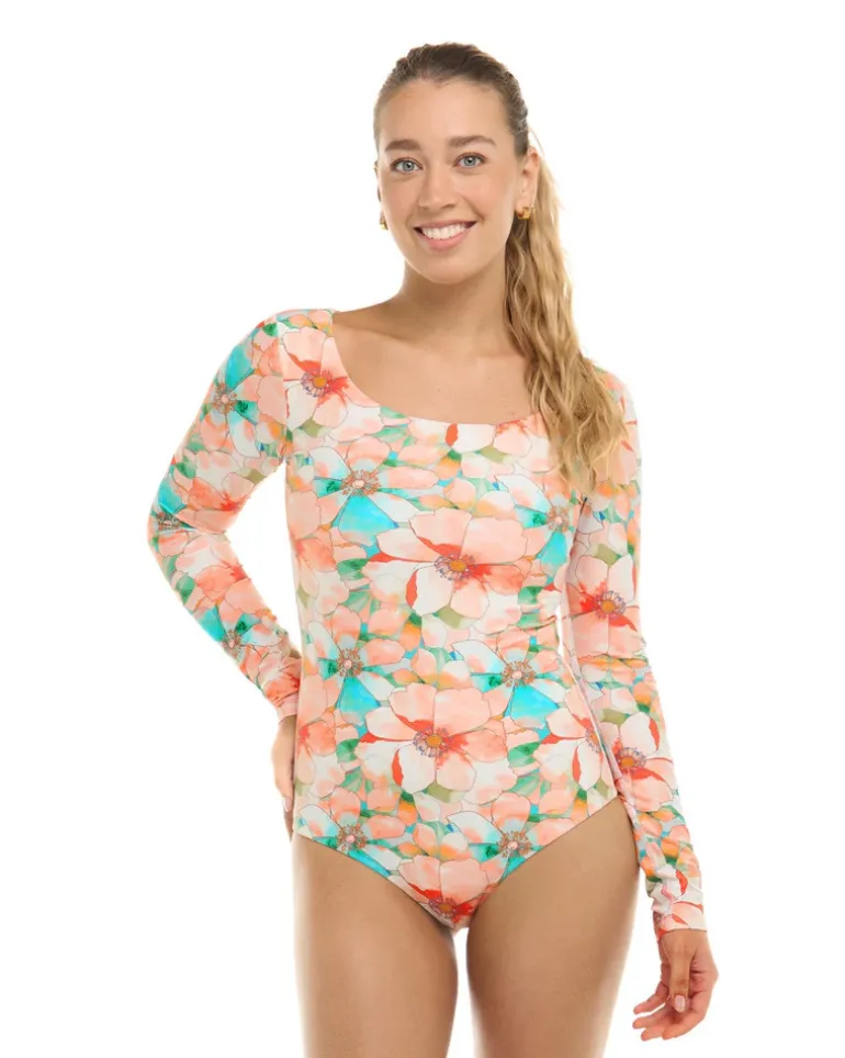 Say hello to Heidi : a perfect blend of style and functionality. This sleek one-piece features UPF 50 sun protection, long sleeves for extended coverage, a wide U-neck for comfort, flatlock seams for smooth wear, and mid-coverage for a stylish yet practical beach day.