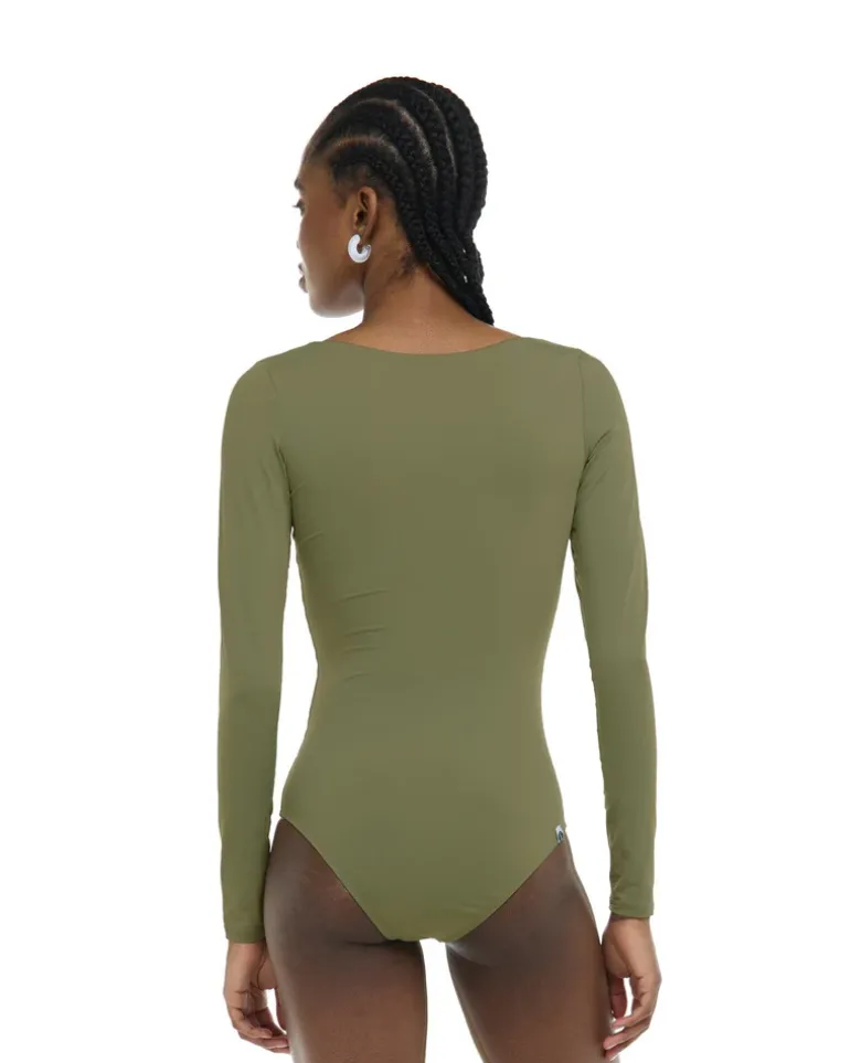 Say hello to Heidi : a perfect blend of style and functionality. This sleek one-piece features UPF 50 sun protection, long sleeves for extended coverage, a wide U-neck for comfort, flatlock seams for smooth wear, and mid-coverage for a stylish yet practical beach day.