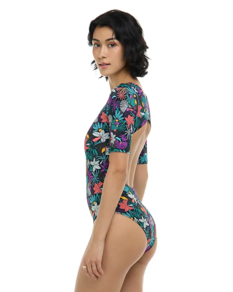Conquer each wave with grace and style with Joan, a tricolor one-piece swimsuit designed for the sporty soul. We’ve kept this silhouette simple with a classic short sleeve and round neck, then jazzed things up around back with a keyhole cutout. Mid-coverage for your booty will stay in place all day, so you can move and groove with total ease.