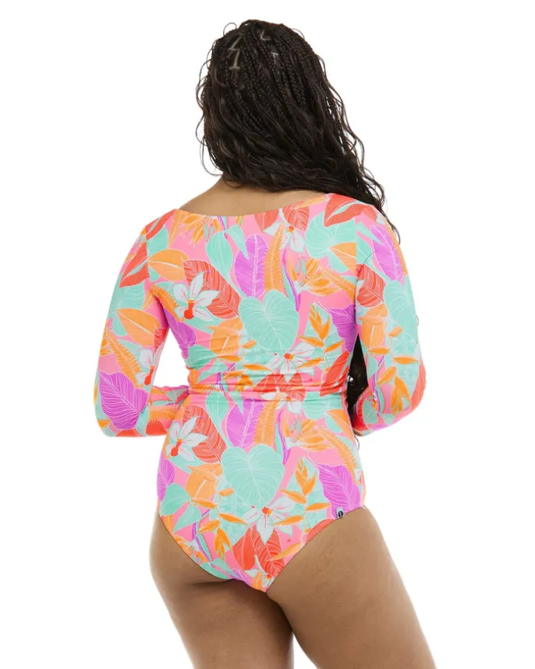 Say hello to Heidi : a perfect blend of style and functionality. This sleek one-piece features UPF 50 sun protection, long sleeves for extended coverage, a wide U-neck for comfort, flatlock seams for smooth wear, and mid-coverage for a stylish yet practical beach day.